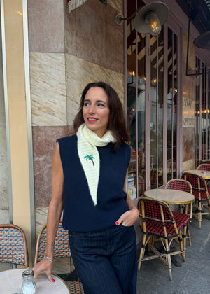 Gestrickter Dreiecksschal mit gelben Streifen und aufgestickten Palmenmotiv.