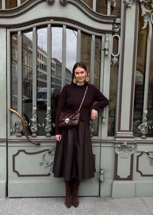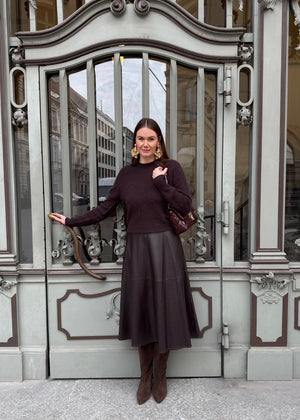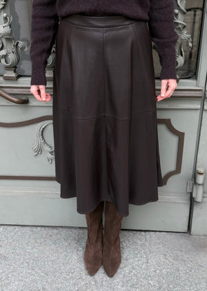 Weiter, schwingender Rock aus fakeLeder Supersoftes Material in Lederoptik Weich angeraute Innenseite Ausgestellte A-Silhouette Reißverschluss in der hinteren Mitte Mittelhohe Taille Seitliche Eingriffstaschen Dekorative Nähte Ungefüttert