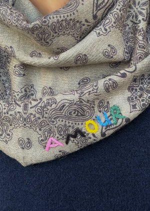 Dünn gewebter Dreiecksschal mit verschiedenen Ornamenten und bunt aufgestickten 'AMOUR' Statement.