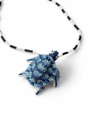 Handgefädelte feine Halskette aus kleinen schwarz/weißen Perlen mit Schildlröten-Anhänger.